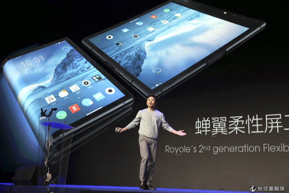 圖為今年 10月底,柔宇科技展示了全世界第一款折疊式智慧型手機,不過可以看到它其實無法完全折起來。