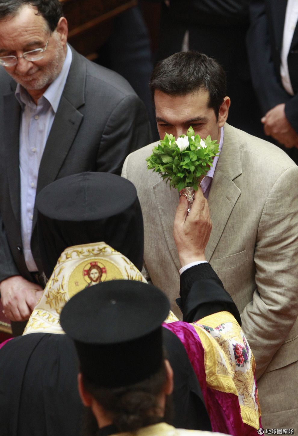 2012年6月,當時剛成為國會議員的齊普拉斯在宣示儀式接受大主教伊羅尼莫斯的祝福。