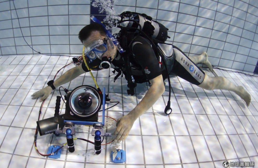 路透社攝影師拉特依(Wolfgang Rattay)正在水底測試自己的水中照相機,因為不久後他就要拍攝當地的游泳冠軍賽。
