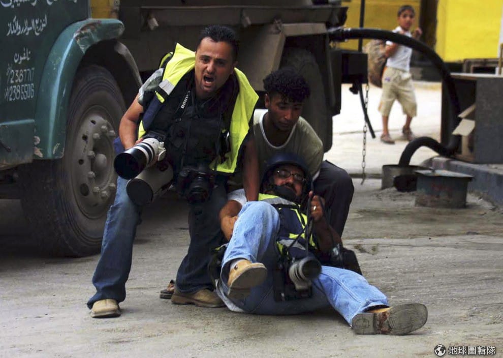 路透社的巴勒斯坦籍攝影師昆西尼(Abed Omar Qusini)在當地的衝突中受傷,他的夥伴趕緊把他拖拉到一旁找遮蔽。