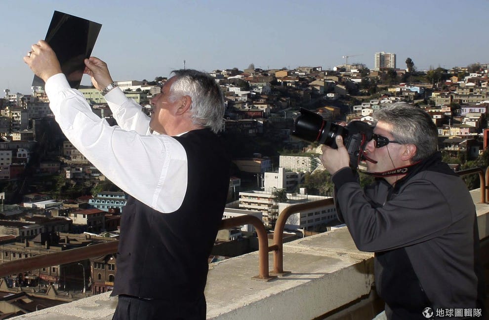 路透社記者費南德茲(Eliseo Fernandez)正在透過專家拿的曝光X光片記錄下日全蝕的現象。