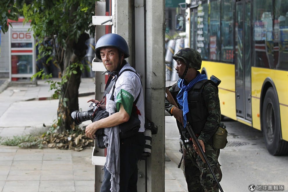 路透社攝影師蓋拉爾德(Eric Gaillard)戴著鋼盔四處張望,他正在曼谷市區內紀錄反政府軍的騷動。