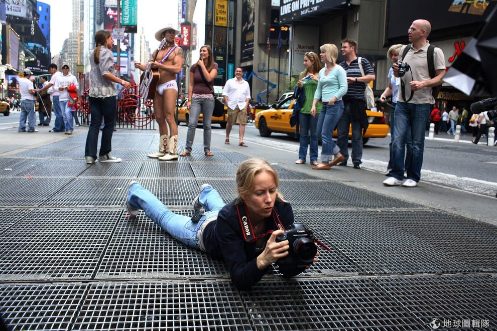 路透社攝影師妮可森(Lucy Nicholson)趴在紐約時代廣場上,她正在記錄一位裸體牛仔的故事。