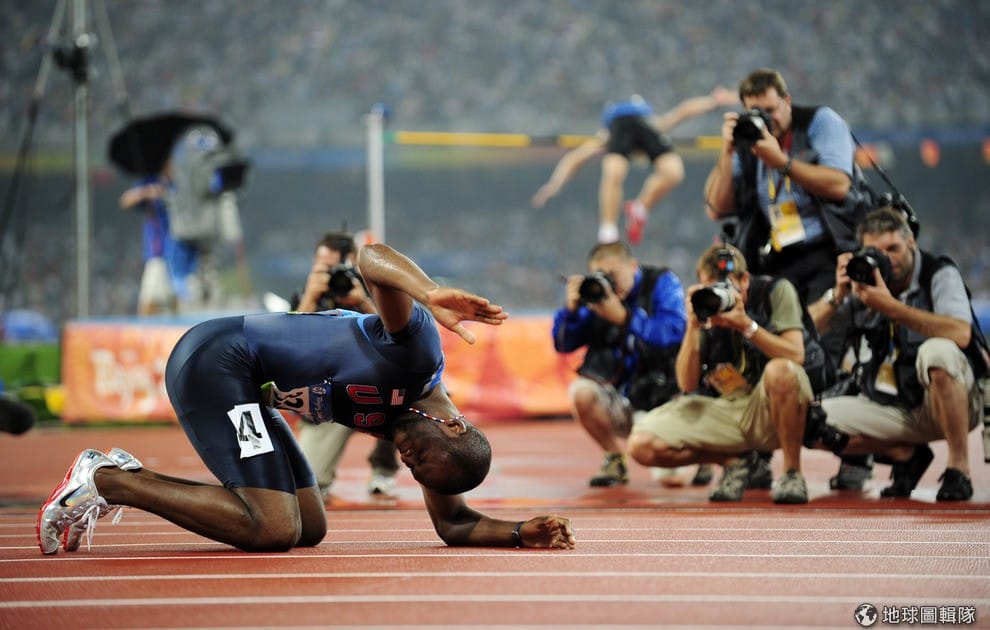2008年北京奧運時,美國代表拉肖恩•梅瑞特(LaShawn Merritt)在知道自己贏得男子400公尺決賽後,開心地忍不住跪地。一旁的記者趕緊記錄下這一刻。