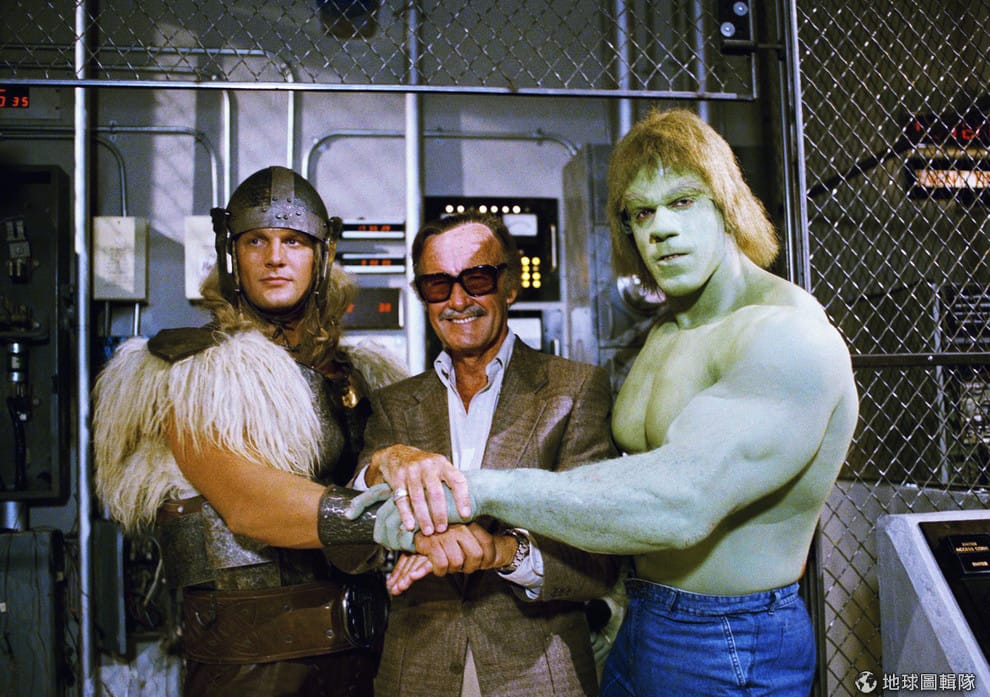 1988年5月,史丹李(畫面中間)和飾演索爾(左)、浩克(右)的演員一同合照,畫面中正在拍攝NBC推出的電視電影《無敵浩克歸來》。