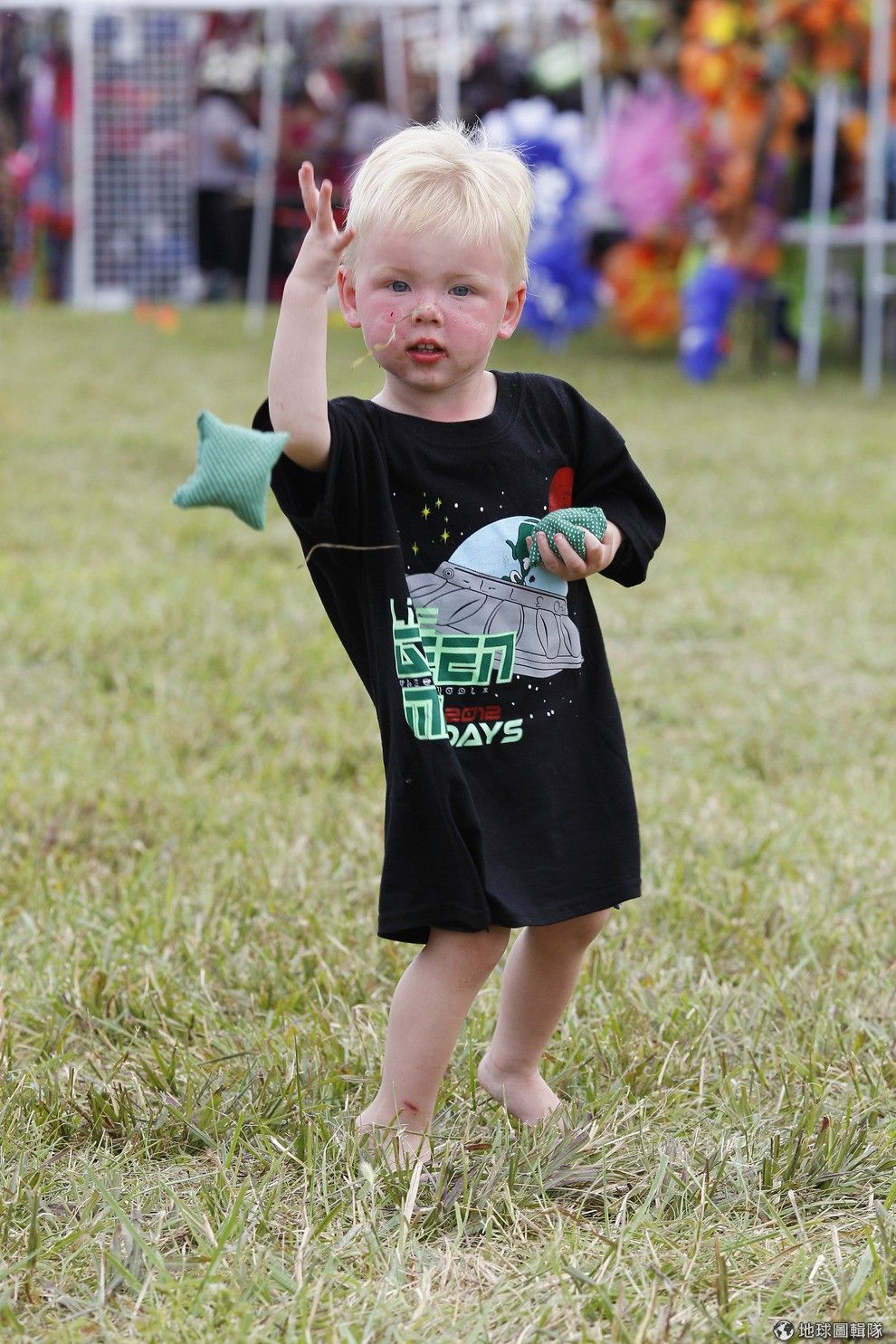 2歲的傑登(Jaden Overton)開心地把「外星人豆包」(Alien bean bag)一一丟出去。