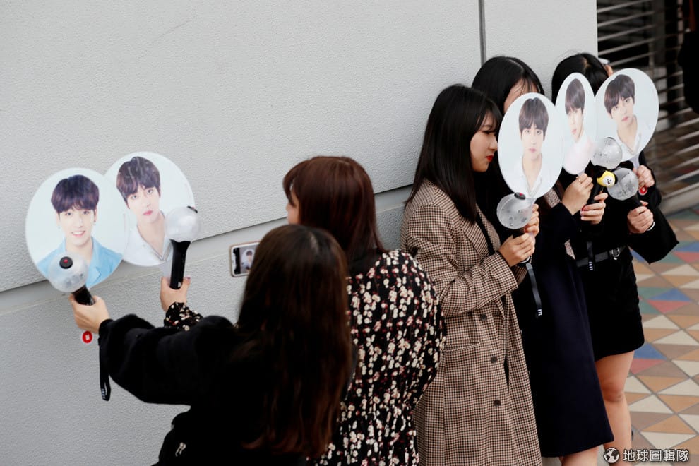 圖為 13號,東京巨蛋的演唱會會場外拿著偶像應援扇的BTS粉絲們。
