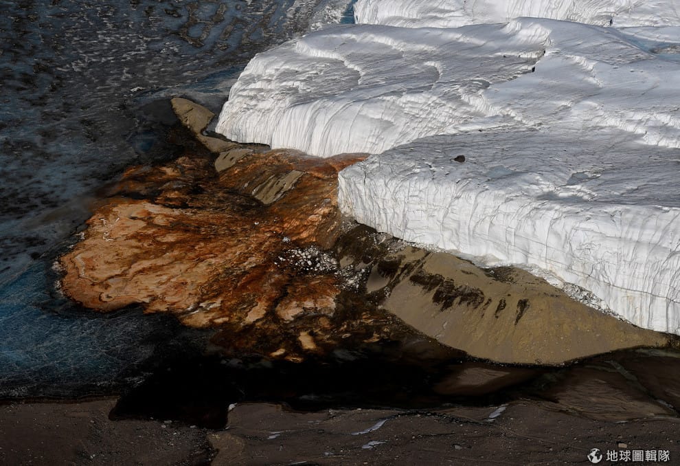 圖為 2016年11月,南極洲的泰勒冰川(Taylor Glacier)。泰勒冰川的水質含鐵,血紅色的流水對比白色的冰川,形成獨特的「血瀑布」一景。