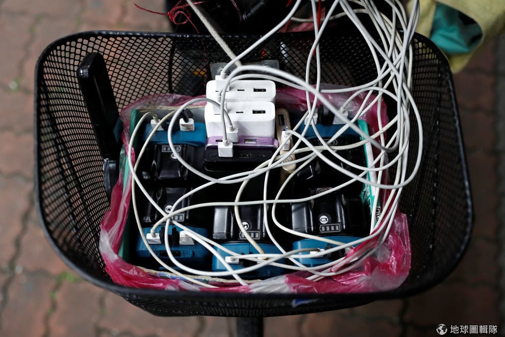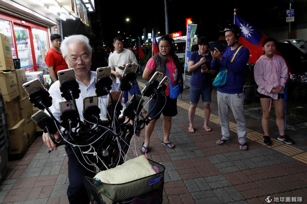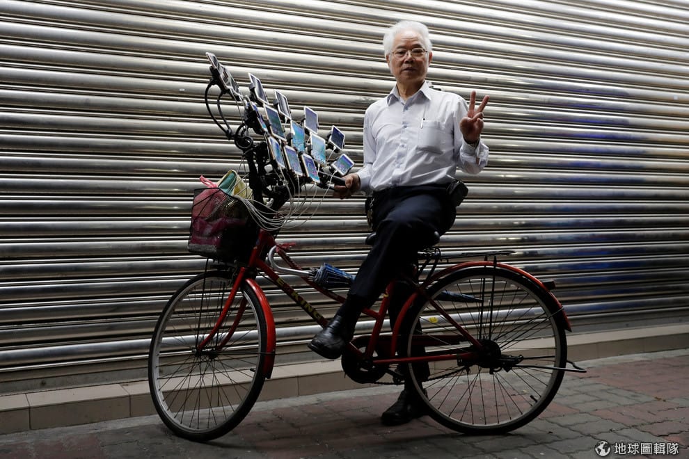來到新北市土城區一帶,這名在網路上被暱稱為「寶可夢爺爺」的陳三元可說小有名氣,因為只要時間一到,他就會騎著腳踏車到鄰近地區的補給站(PokéStop)抓寶——當然,抓寶本身沒什麼稀奇,但最引人注目的,就是裝備在腳踏車籃的扇型支架上,那 15支智慧型手機。