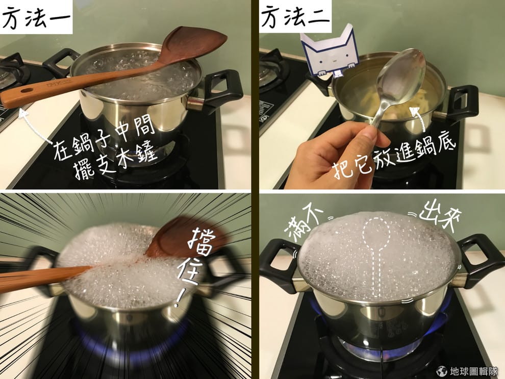 下次碰到這樣的狀況,不妨先在鍋子上擺個可以橫跨在鍋子上的木製湯匙、鍋鏟、筷子等等,藉此破壞泡沫的表面張力、阻止沸騰的水溢出。