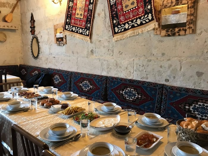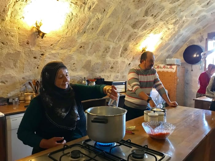 廚藝教室是個小圓頂空間,天花板的石塊上還可看見被炊煙燻過的痕跡。是這裡古早同樣作為廚房用途的最佳證明。主廚是托爾嘎的母親夏娃(Havva),非常和藹可愛,運用近五十年的烹調經驗和一雙魔手傳授最道地的手路菜。托爾嘎在旁扮演母親的最佳翻譯兼主持人,妻子和兒子則擔任課堂助教和機動人員,一家人合作無間。