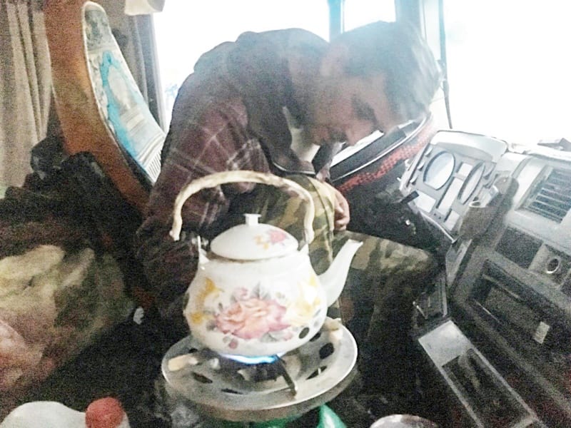 網友黃泳晞出去後發現貨車司機還在等我,照理說他帶我到入境口便已完成任務可以離開,不免有點感動。在海關耽擱了時間,我們往前開了約20公里便被攔下,告知已過帕米爾通行時段,須在高原上停留一晚。司機見怪不怪,熟門熟路地開到一旁的卡車集散處,準備在這過夜。