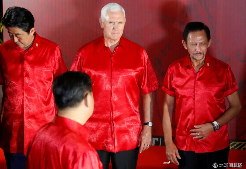 17號晚上,當APEC高峰會代表穿上巴布亞紐幾內亞設計的上衣,準備拍晚宴團體照。此時,美國副總統彭斯(後排中)看到了中國領導人習近平(前)。在彭斯右手邊的則是日本首相安倍晉三,左手邊是汶萊蘇丹兼首相包奇亞(Hassanal Bolkiah)。