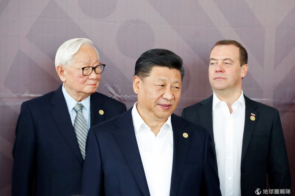 18號這天,在APEC經濟領袖高峰會上,由左至右可以看到中華民國代表張忠謀、中國領導人習近平和俄國總理梅德韋傑夫(Dmitry Medvedev)出席。
