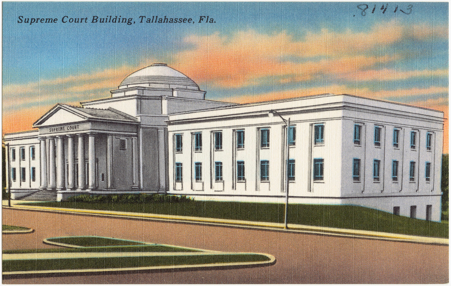 在畫面中的明信片中,圖為佛羅里達州最高法院的模樣。