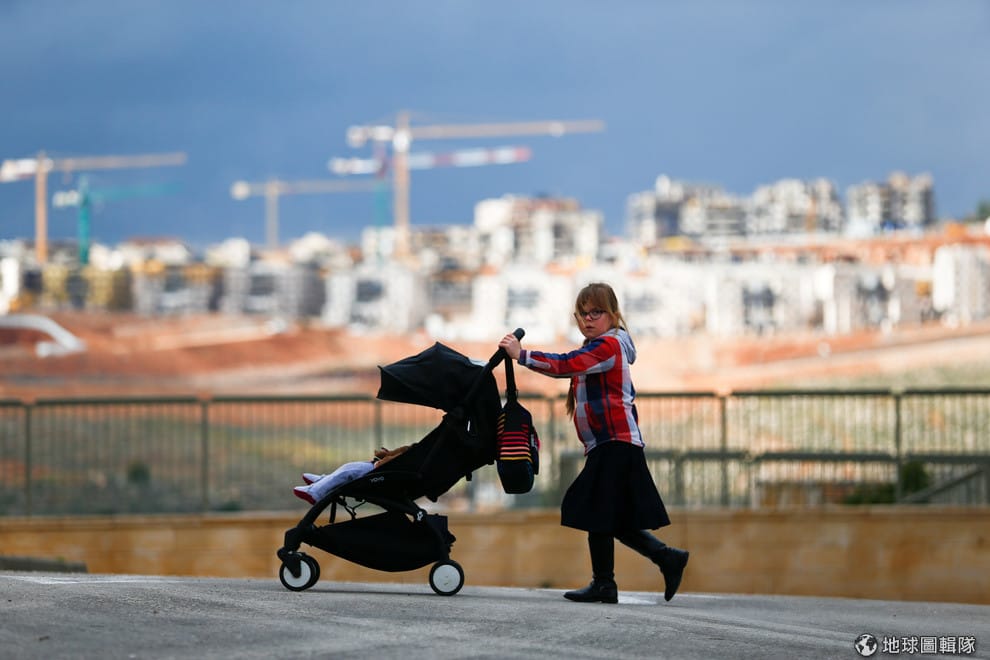 在以色列位於約旦河西岸的佔領區,一名小女孩推著嬰兒車,她的身後是正在大興土木的工地。