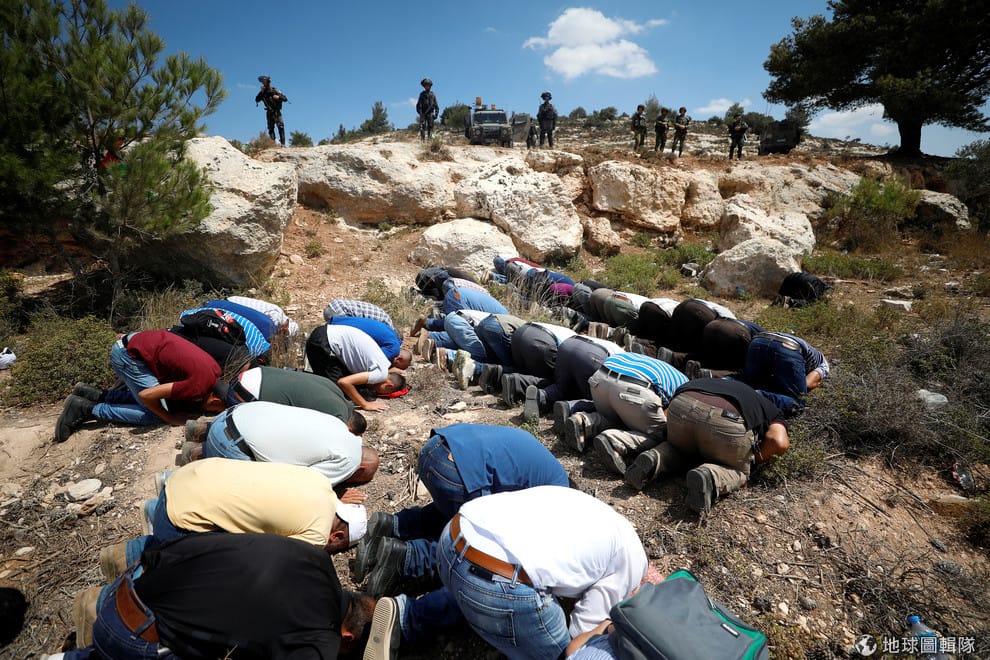 時至今日,以色列佔領區不時發生以巴衝突。圖為一群在以色列佔領區內跪在以色列軍人前祈禱的巴勒斯坦人。