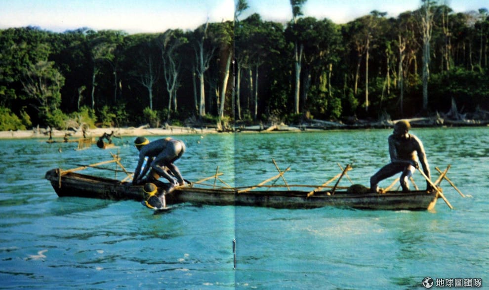 在這張發布於 2004年、拍攝日期不明的照片中,桑提內爾人正在使用獨木舟。