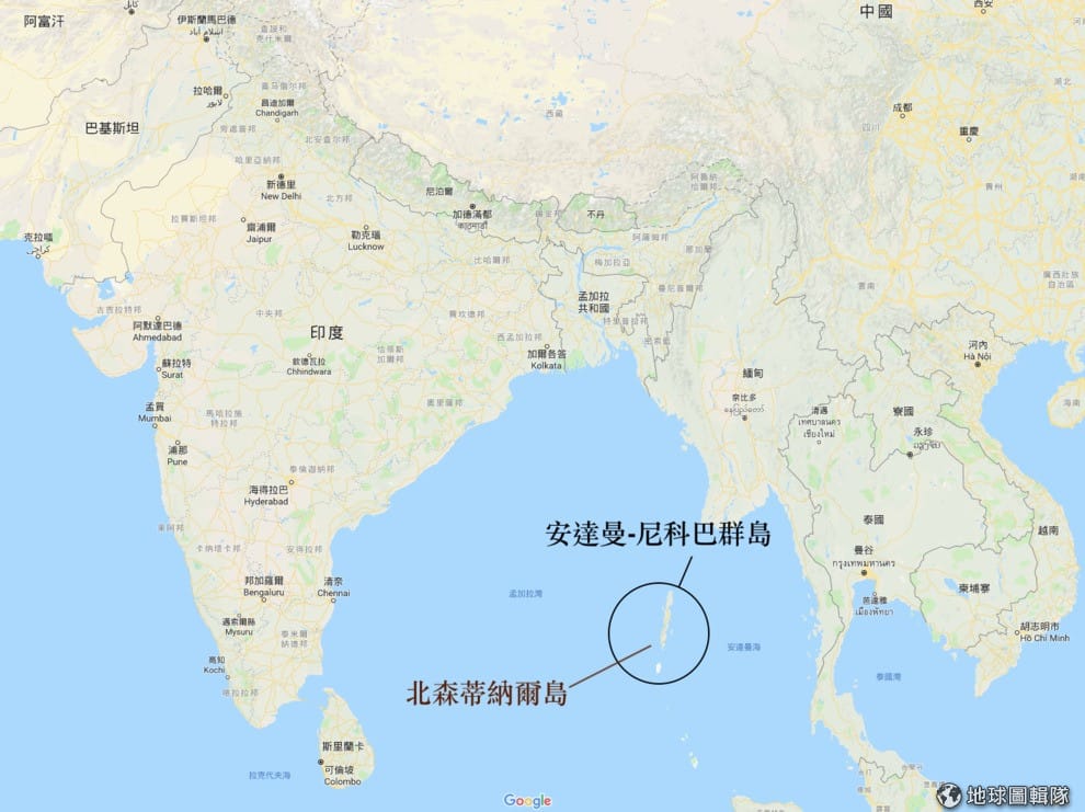 圖為安達曼-尼科巴群島的位置,以及北森蒂納爾島所在處。