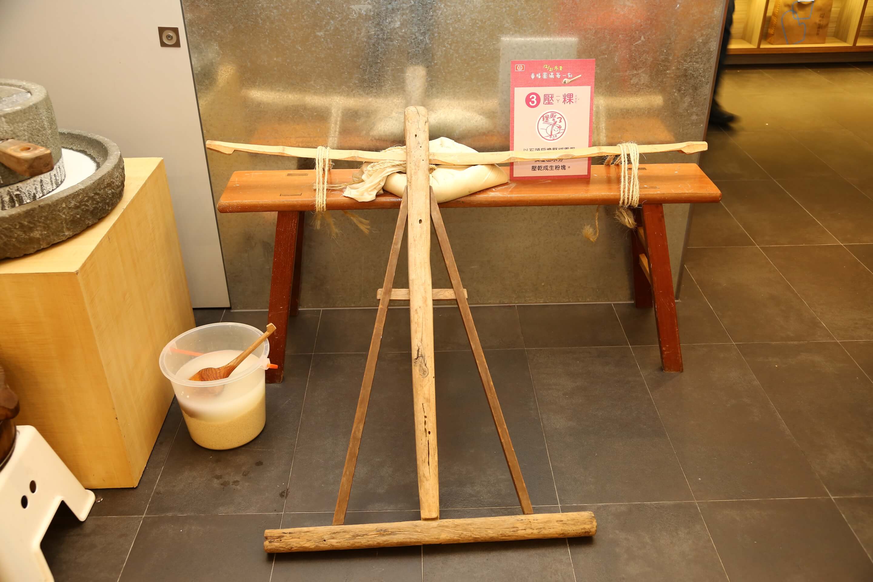 把磨好的圓糯米漿倒入粿袋中綁緊,用石頭和扁擔重壓出水成為生粉塊,你的傳統湯圓就完成一半囉!