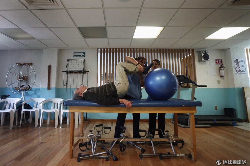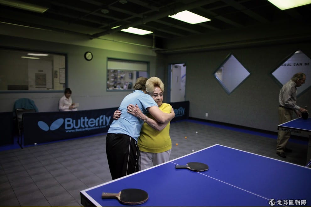照片中是美國洛杉磯當地一家照護阿茲海默症患者的中心,患者們正在接受打乒乓球的療程,藉由運動增加他們的心跳和大腦血流量,改善他們的症狀。