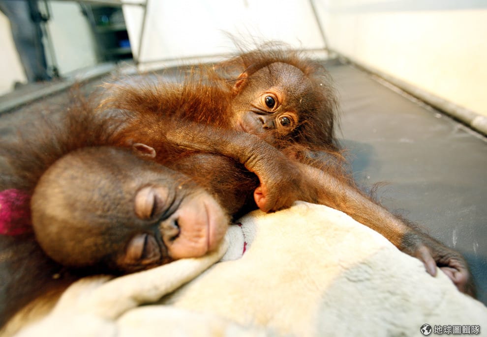 2007年2月在印尼茂物野生動物園的動物醫院裡,一對紅毛猩猩母女正在接受照護。