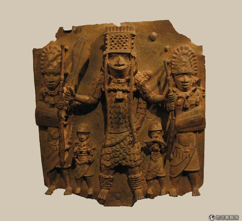 圖為一塊「貝南青銅器」匾額,裡頭描繪著一名戰士身邊跟著兩名握有盾牌的士兵。「貝南青銅器」指的是 1897年英國入侵貝南帝國(Kingdom of Benin)時,取得的 3,000件銅製品。