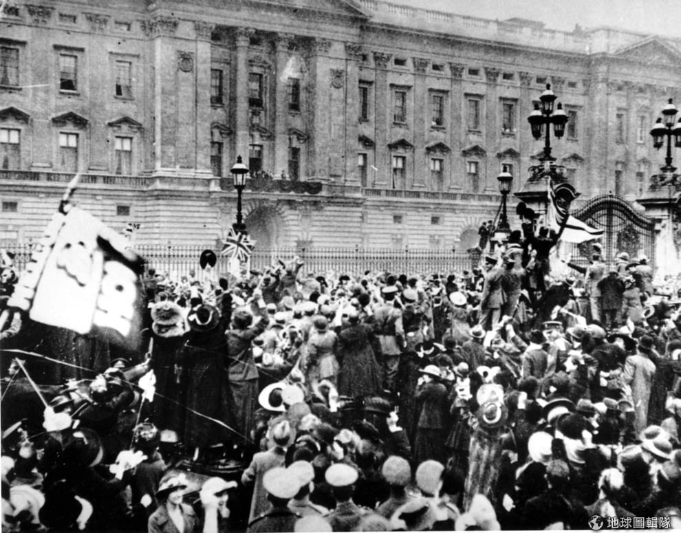 1918年11月11日在英國倫敦,人們拿著英國國旗聚在白金漢宮(Buckingham Palace)前,慶祝戰火終於平息了。