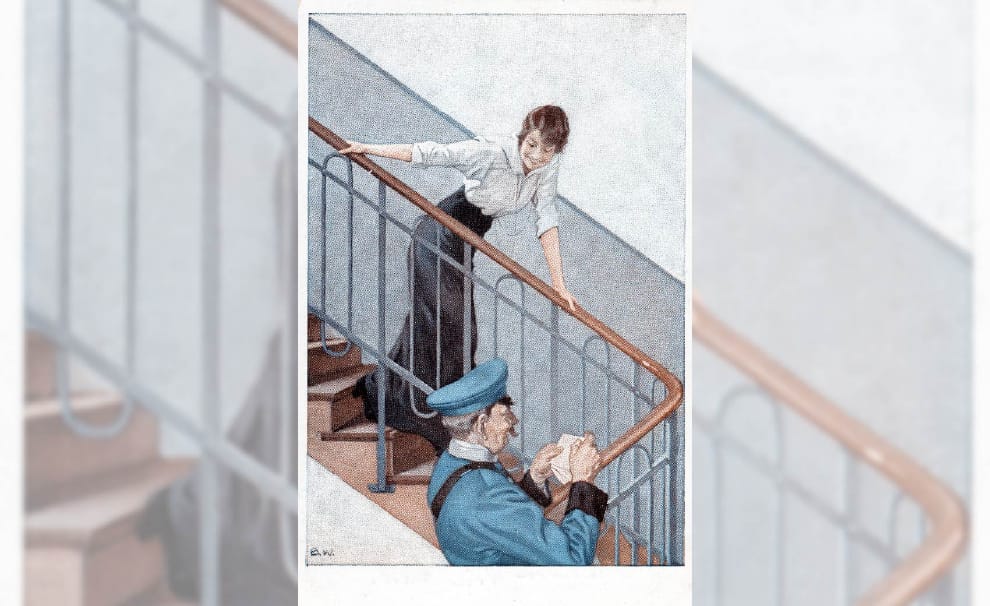 在這張繪製於 1915年的明信片中,描繪出一名女子興奮地等到了專門替士兵收發信的郵差。