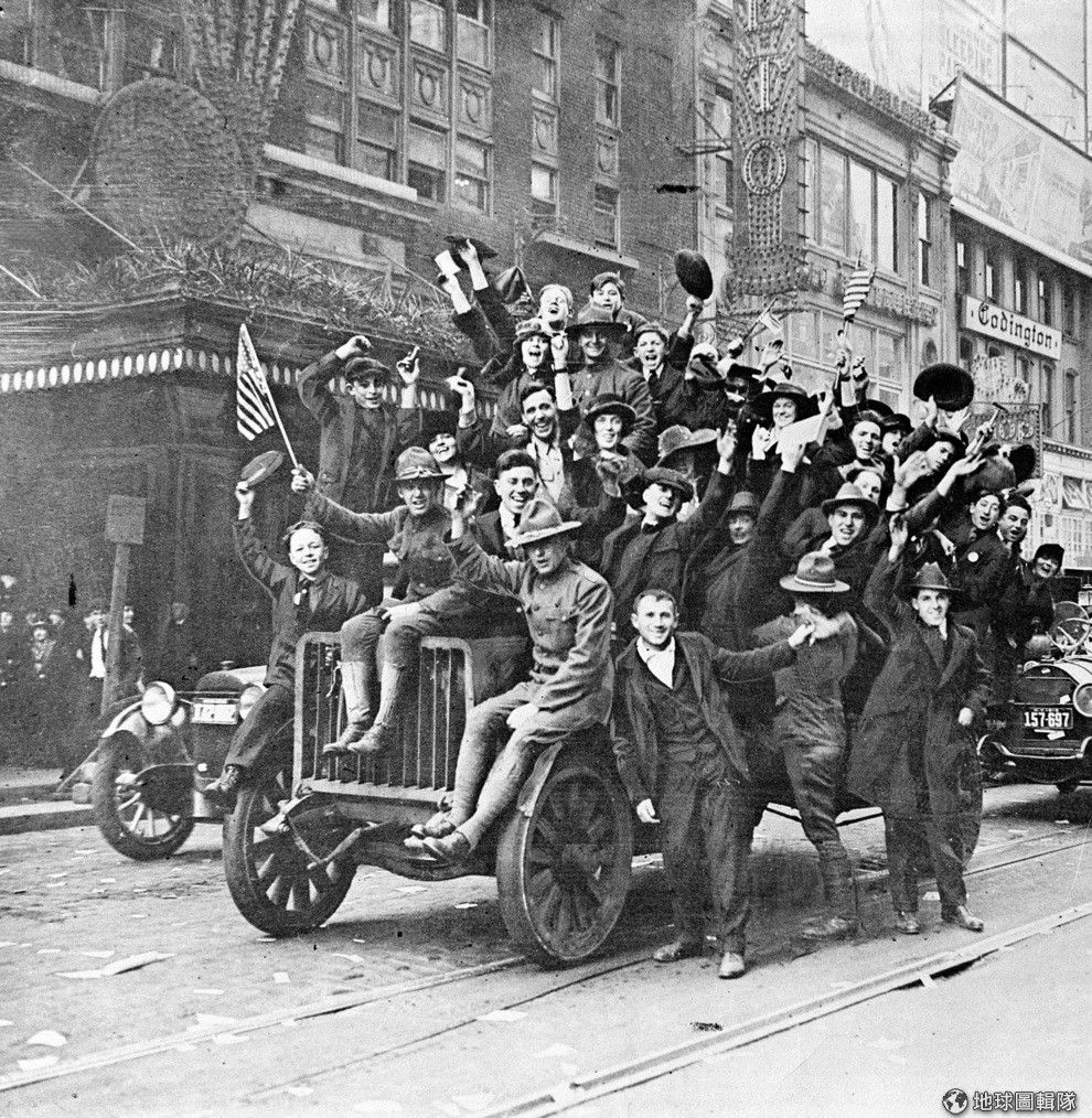 1918年11月11日的紐約街頭,一車子的人們歡欣慶祝停戰日的到來。