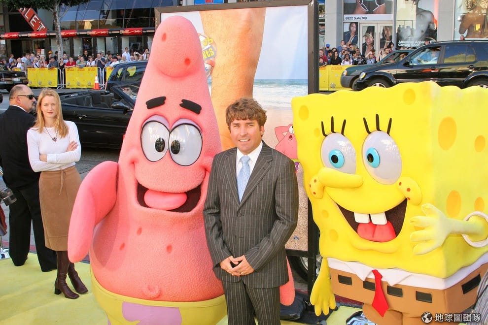 在《海綿寶寶》電影首映會上,創作出海綿寶寶的希倫伯格與海綿寶寶和派大星合照。