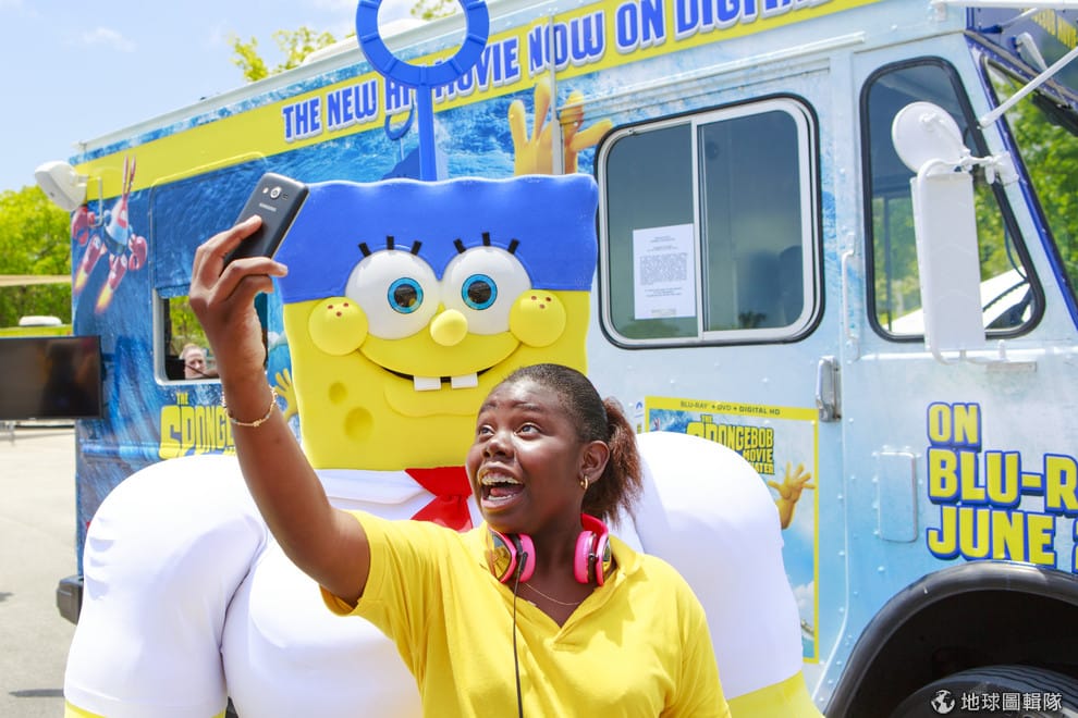 2015年,在美國佛羅里達州的邁阿密,粉絲正在跟電影《海綿寶寶:海陸大出擊》的宣傳布景自拍。