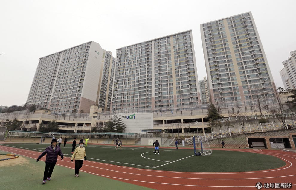 圖為 2016年1月,民眾在南韓釜山的學校操場上做運動。操場旁的大型住宅機構,就是當年兄弟福祉院所在的位置。