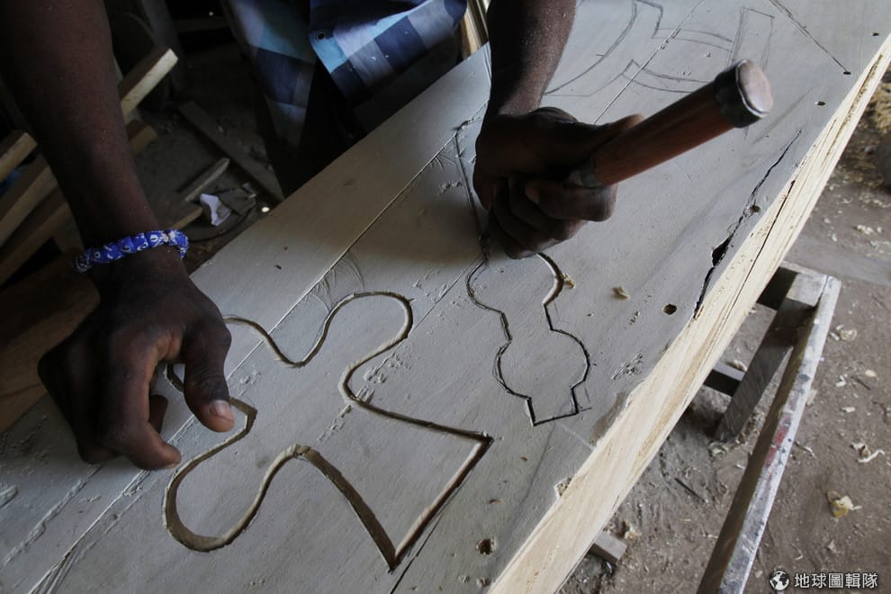 一名木匠正在設計造型棺材,他們通常會使用被稱為wawa wood的硬木來打造棺材。