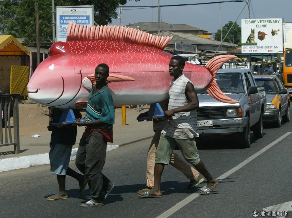 乍看之下,你猜得出來迦納人扛著的粉色魚木製品裡頭裝了什麼嗎?