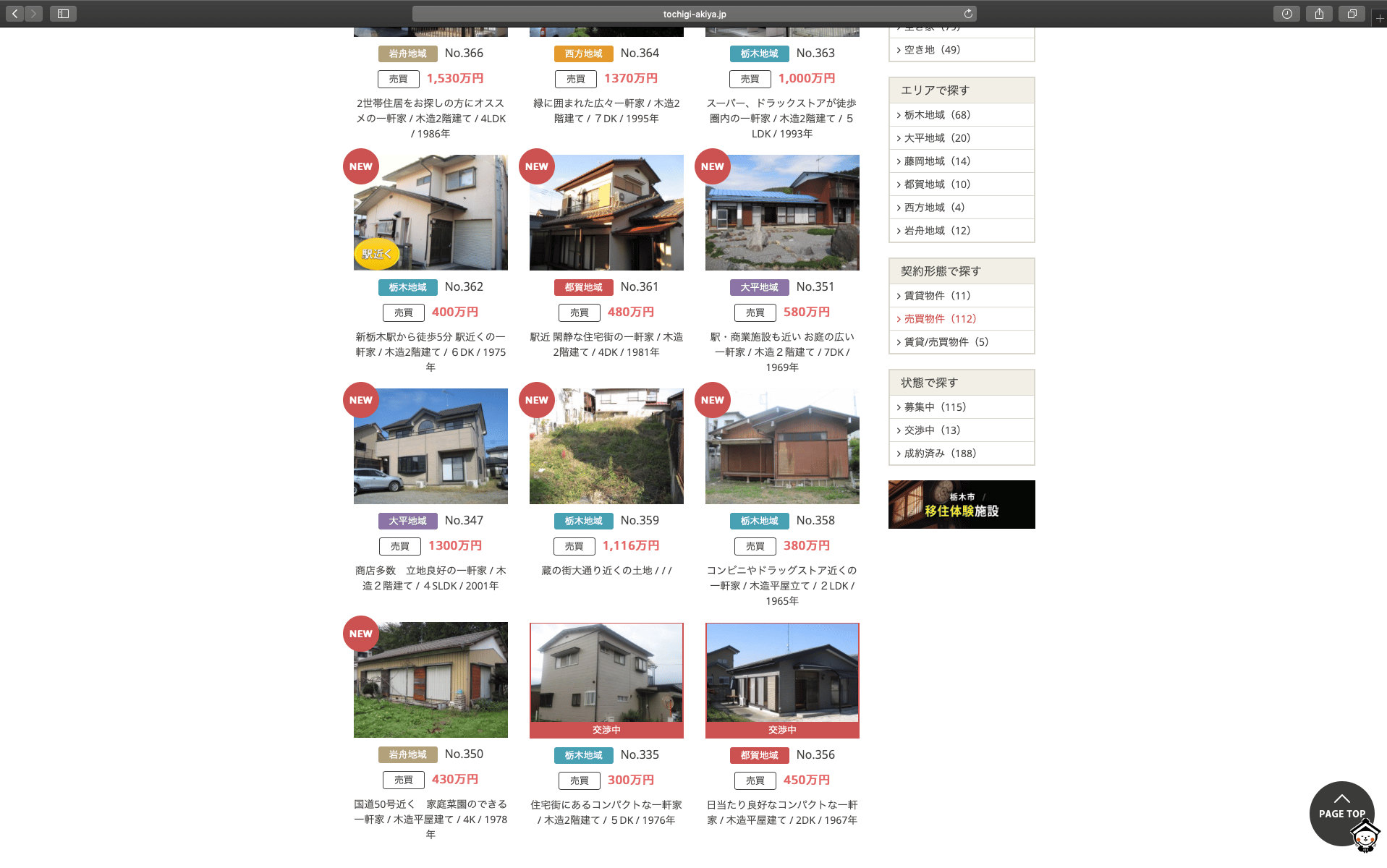 圖為栃木市的空屋銀行,可以看到屋子年齡、大小都對房價有影響,不同房子的價格差異也很大。