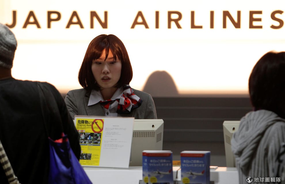 圖為 2010年1月,在日本東京成田機場,一名JAL的工作人員替乘客辦理報到手續。