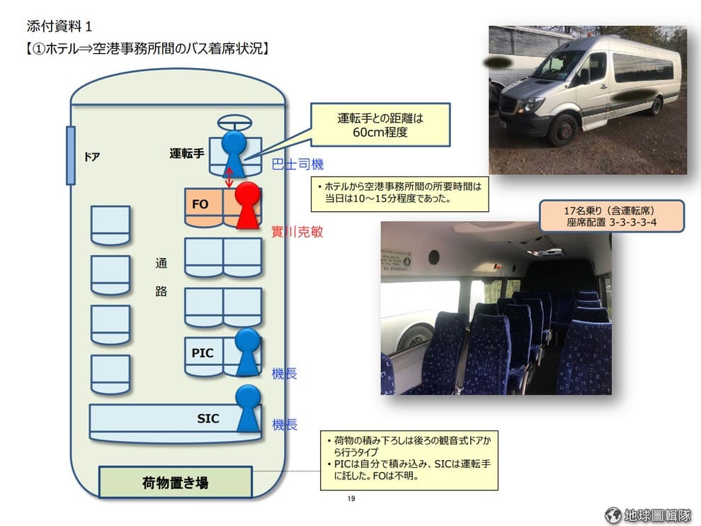 這是副機長實川克敏和另外兩名機長從飯店前往JAL機場辦公室的巴士座位圖,實川克敏(紅色)的座位和另外兩名機長有一段距離,而讓另外兩名機長沒有辦法察覺到實川克敏身上的酒味。