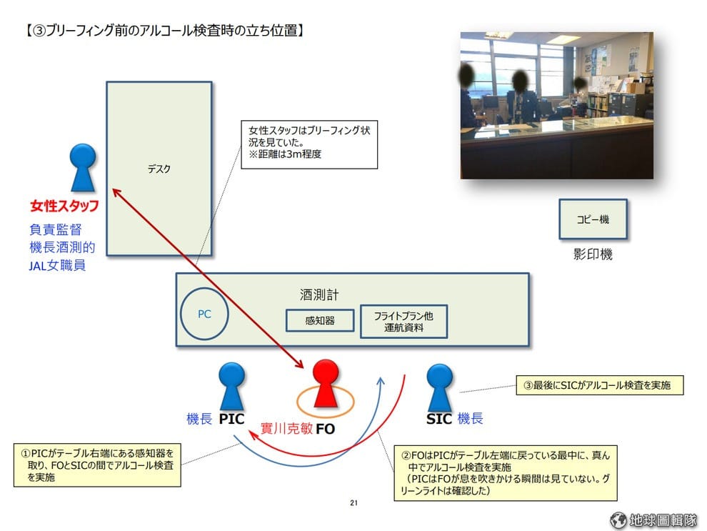 網友JAL抵達JAL機場辦公室後,實川克敏和另外兩名機長在辦公室女職員的監督下進行酒測。實川克敏就站在兩名機長的中間,而女職員和實川克敏距離約 3公尺左右。