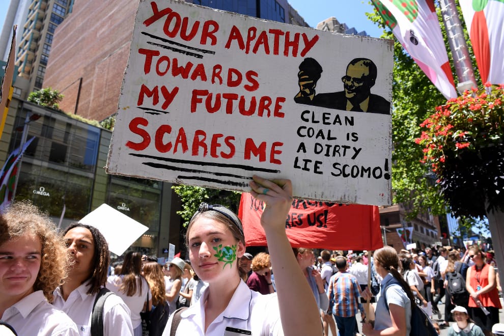 30號在雪梨的示威現場,一名學生手上的標語寫道:「你對我的未來漠不關心的程度著實嚇壞我了(乾淨的煤是個骯髒的謊言)。」表達出對澳洲總理莫理森的不滿。