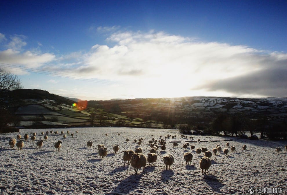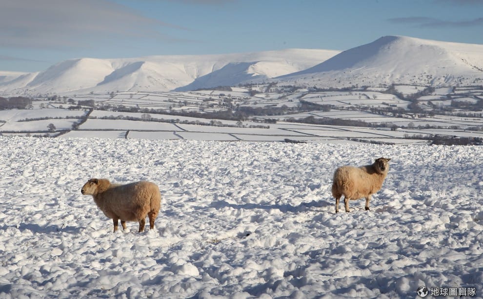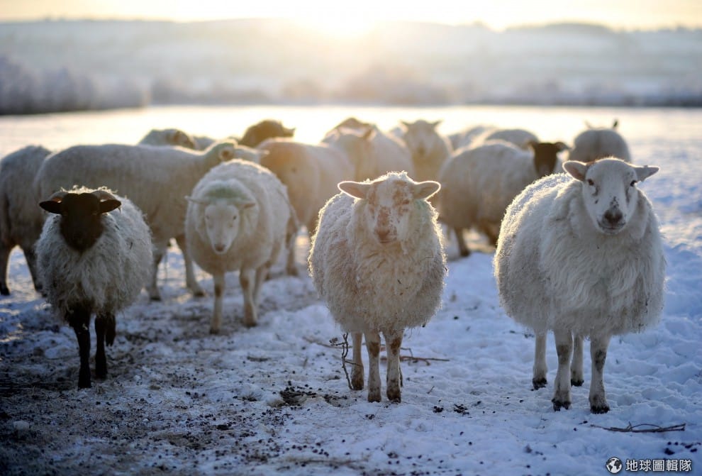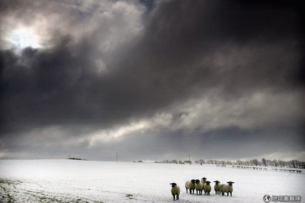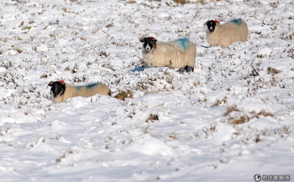 另一群英國羊咩咩,他們是屬於「黑臉」羊喔,黑色的頭在雪地中好顯眼!圖片來源:Christopher Furlong/Getty Images