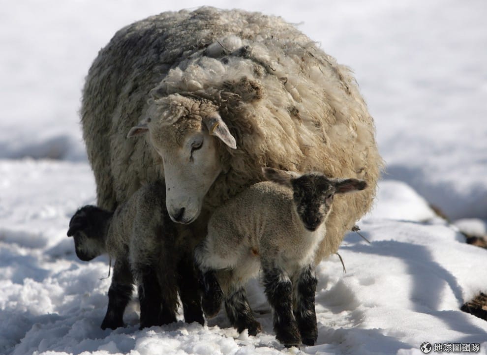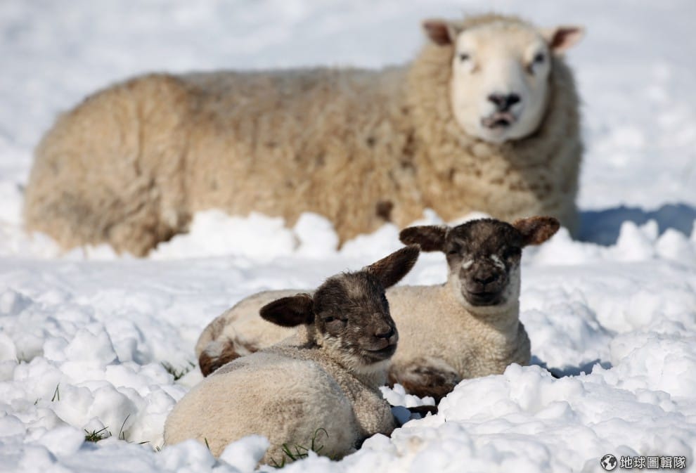 剛出生的2隻小羊,只能依偎在羊媽媽身邊避避風寒,感覺好溫馨喔!圖片來源:Matt Cardy/Getty Images