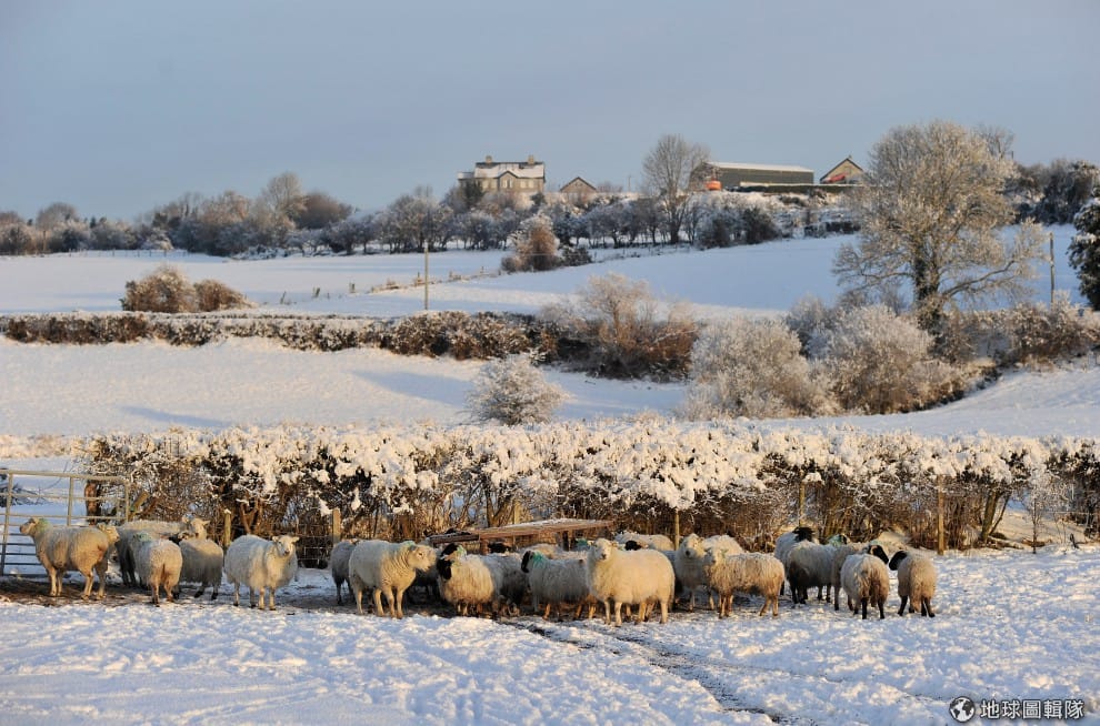 「你看不到我、看不到我...」,愛爾蘭當地的羊群全縮在被大雪覆蓋的樹叢旁邊,一團一團的白雪球,乍看還以為碰上成群結隊的羊大軍!圖片來源:Gareth Cattermole/Getty Images