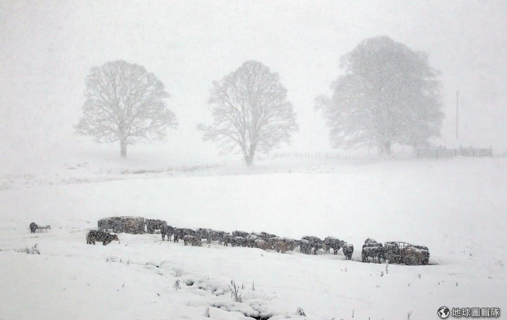 蘇格蘭地區大雪紛飛,連遠方的大樹都霧化成灰濛濛的背景。圖片來源:Jeff J Mitchell/Getty Images