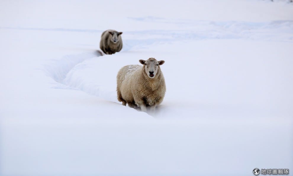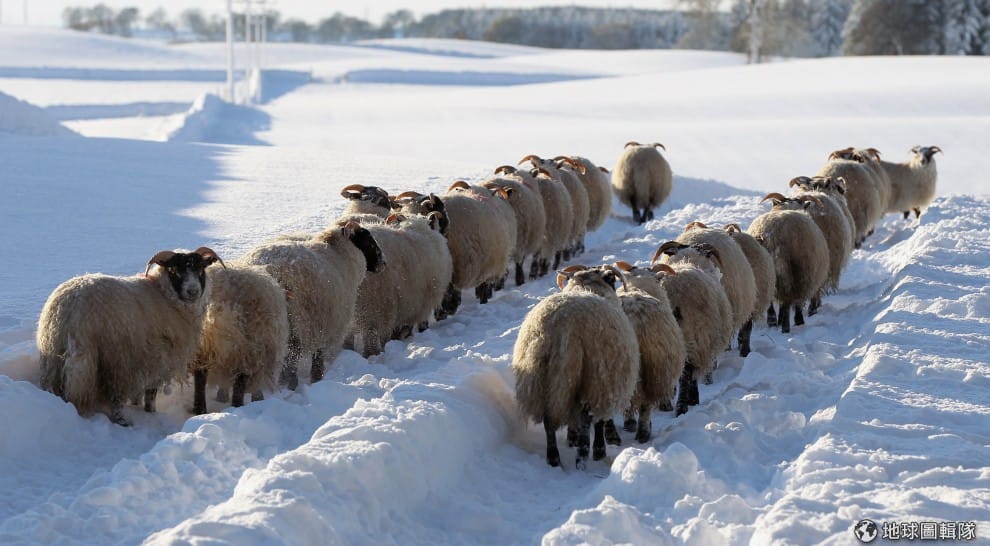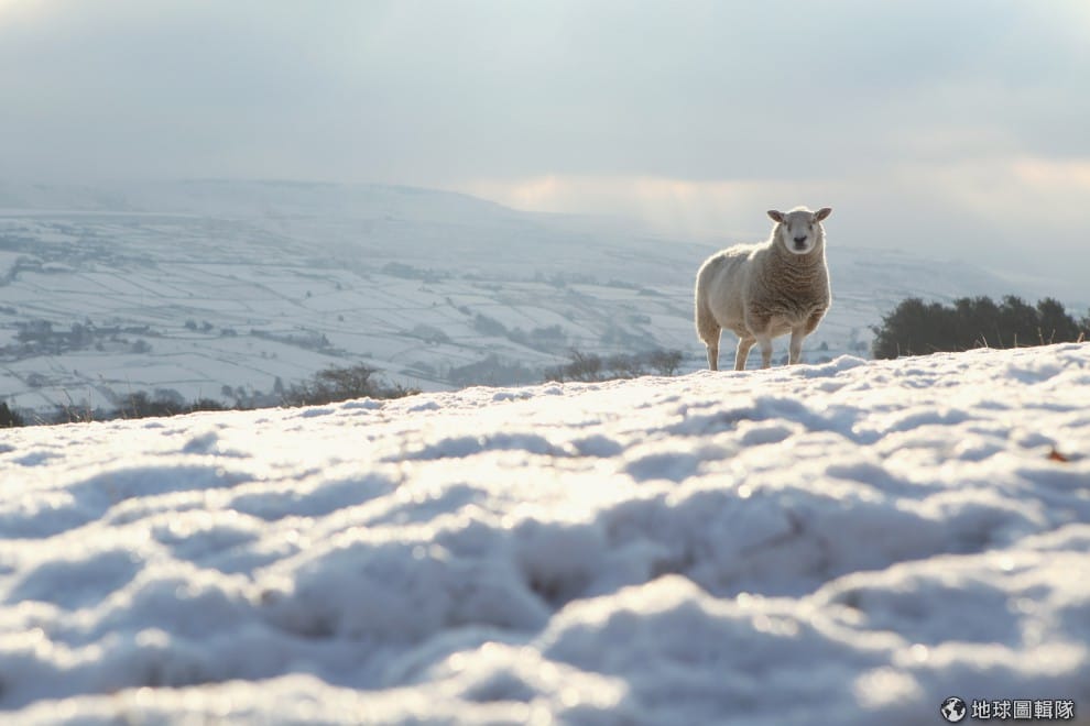 看起來跟棉被一樣蓬鬆的雪地,只留下羊咩咩們的足跡。困在雪地裡面的牠們,應該也很希望這是真的棉被,而不是寸步難行又好冷的雪地吧!圖片來源:Jeff J Mitchell/Getty Images