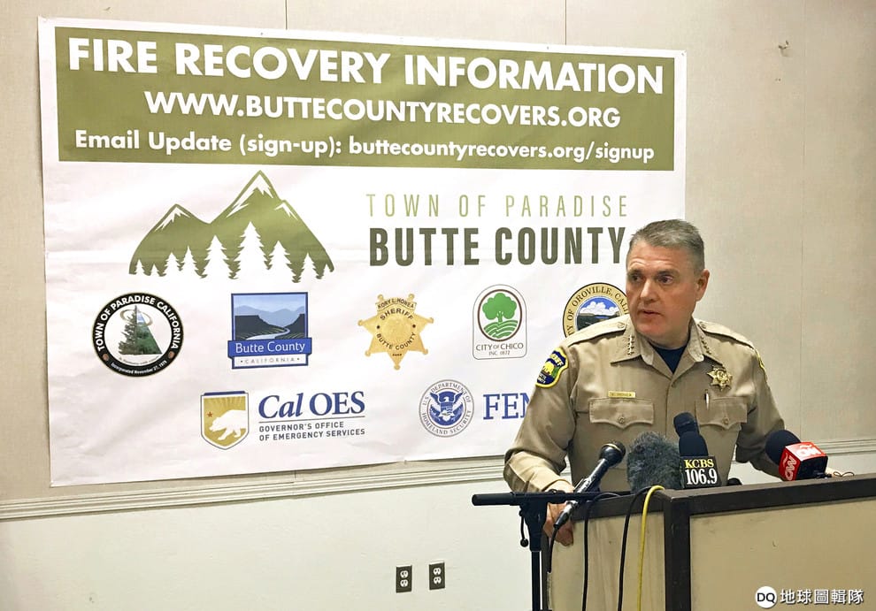 11月21日,標特郡警長哈尼亞正在對大眾報告「坎普大火」造成的傷害以及當局控制火勢的進度。