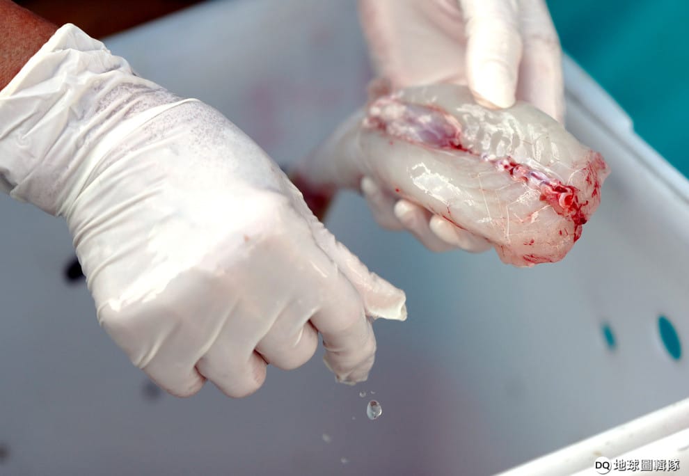 圖為今年 11月,在日本千葉縣夷隅市的大原港,70歲的山本洋子正在處理剛捕上岸的河豚肉。