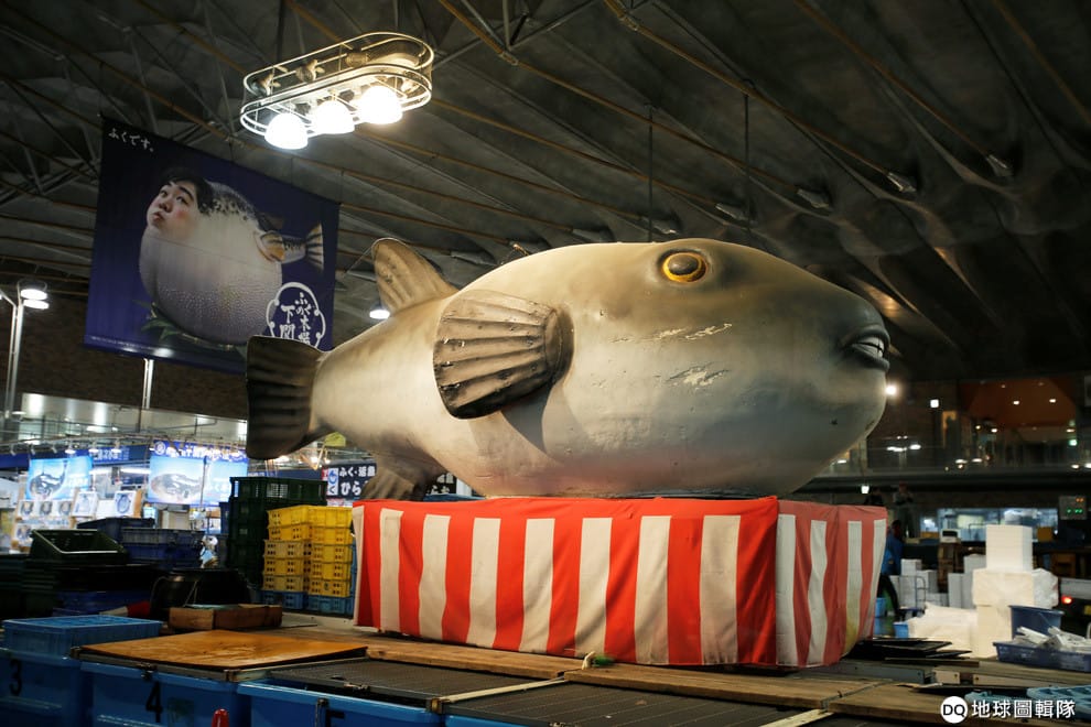 圖為今年 11月,在日本山口縣下關市的唐戶市場裡,出現了一隻大型河豚雕像。