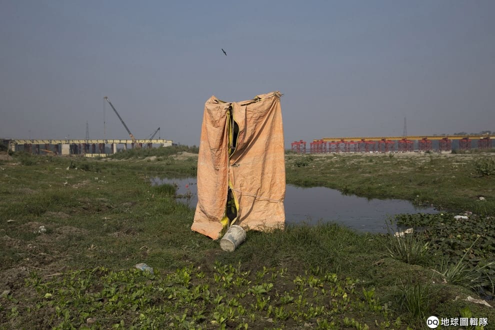 圖為 2015年11月,在印度新德里(New Delhi)亞穆納河(Yamuna River)河畔,出現一間農夫們臨時搭建的廁所。