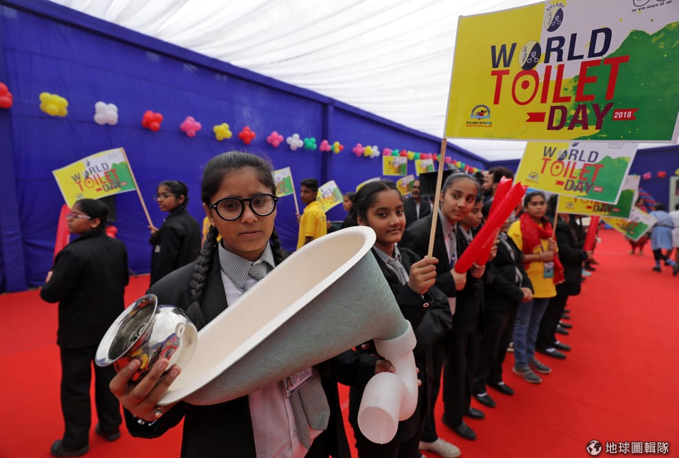 圖為上個月 19號,適逢世界馬桶日,印度女學生拿著馬桶的複製品排排站,希望國內的公衛設施有一天能夠普及。